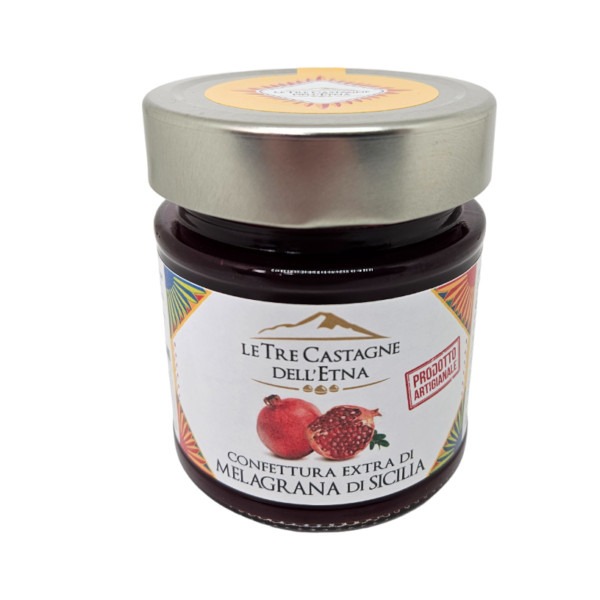 Confettura extra di Melagrana di Sicilia prodotta con frutta fresca siciliana accuratamente selezionata con un procedimento di cottura che rispetta le proprietà nutritive e le caratteristiche della frutta e che consente di sfruttarne gli zuccheri naturali, aggiungendo quindi una ridotta quantità di zucchero.
